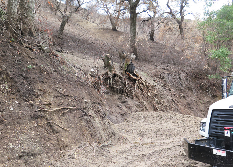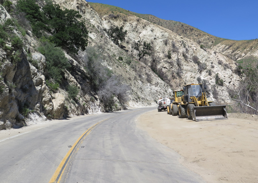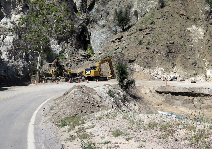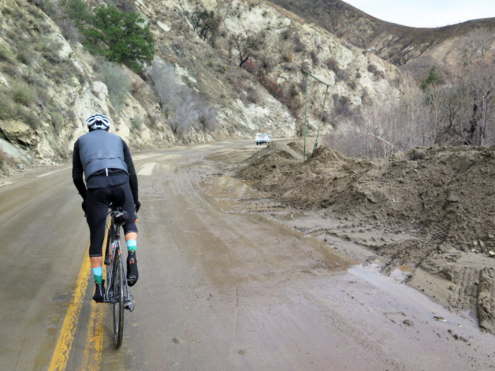 You’ll see a number of washouts that have affected the road. This one has undercut the road and damaged the surface to the point that it’s all gravel for a portion. Watch your descent.